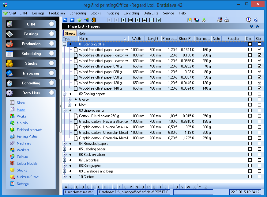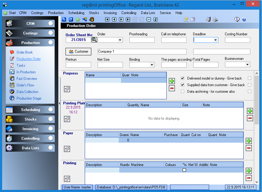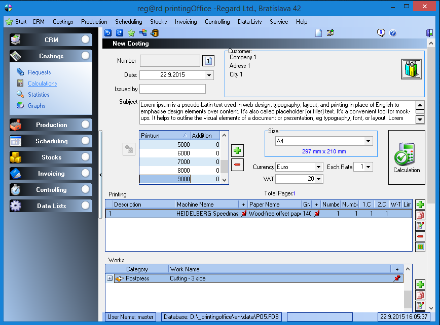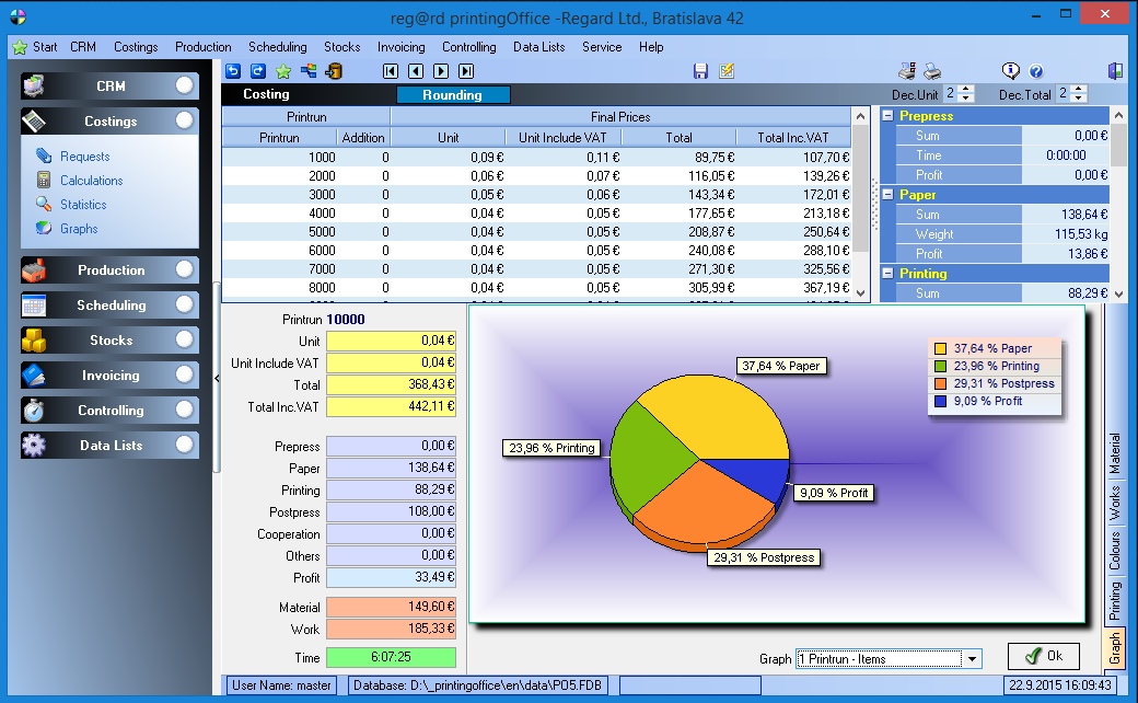 It is a software application designed for printing companies to quickly and confidently produce quotations, orders, job cards, invoices, delivery notes and production control data in minutes. printingOffice handles everything from print calculations and production management to invoicing and business case administration. It allows you to track an order from the moment it is placed, through every stage of production, all the way to delivery. Another valuable feature is the evaluation of machine and employee utilization, which should not be underestimated.